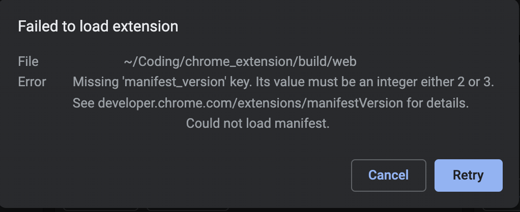 my_chrome_extension/build/web folder.You should immediately get an error related to a missing manifest_version key that looks like this:
